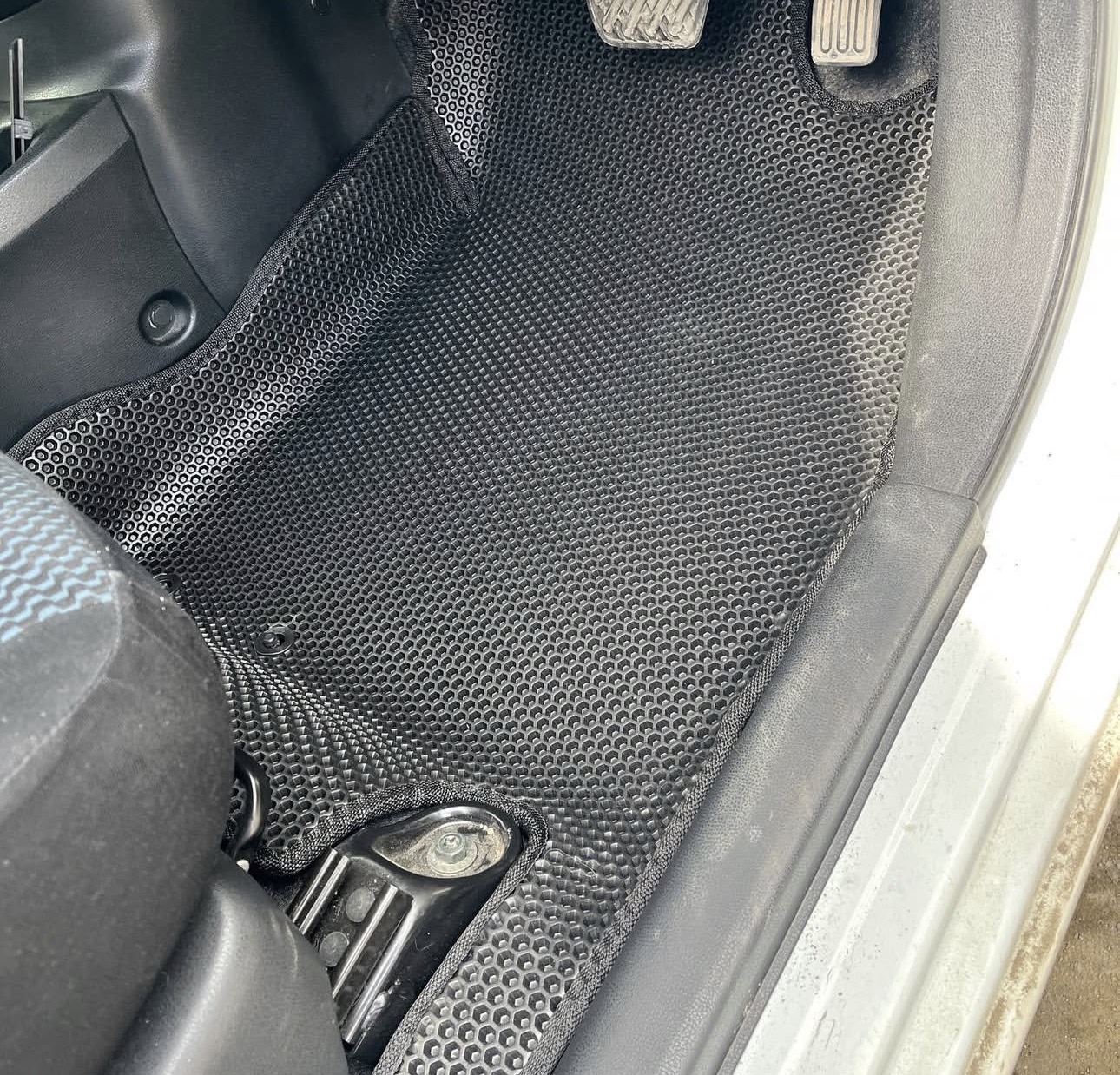 Коврики формуются и подгоняются так, чтобы не мешать педалям и не топорщиться по краям.